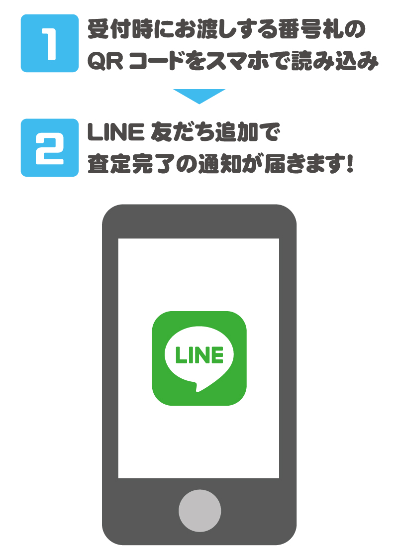 - ご利用いただくには、対象店舗でご案内する買取受付の番号札に記載されたQRコードを読み込んで、対象店舗のアカウントを友だちに追加していただく必要がございます。