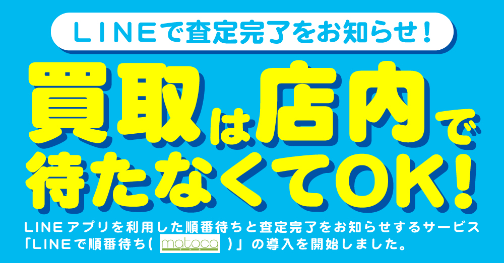 LINEアプリを利用した順番待ちと査定完了をお知らせするサービス「LINEで順番待ち(matoca|マトカ)」を導入しております(一部店舗を除く)。